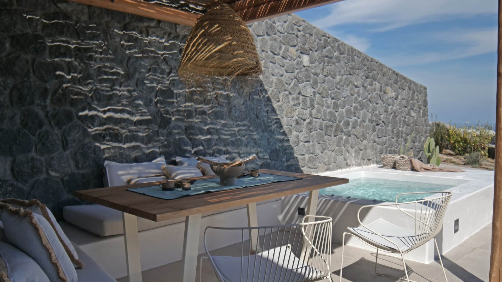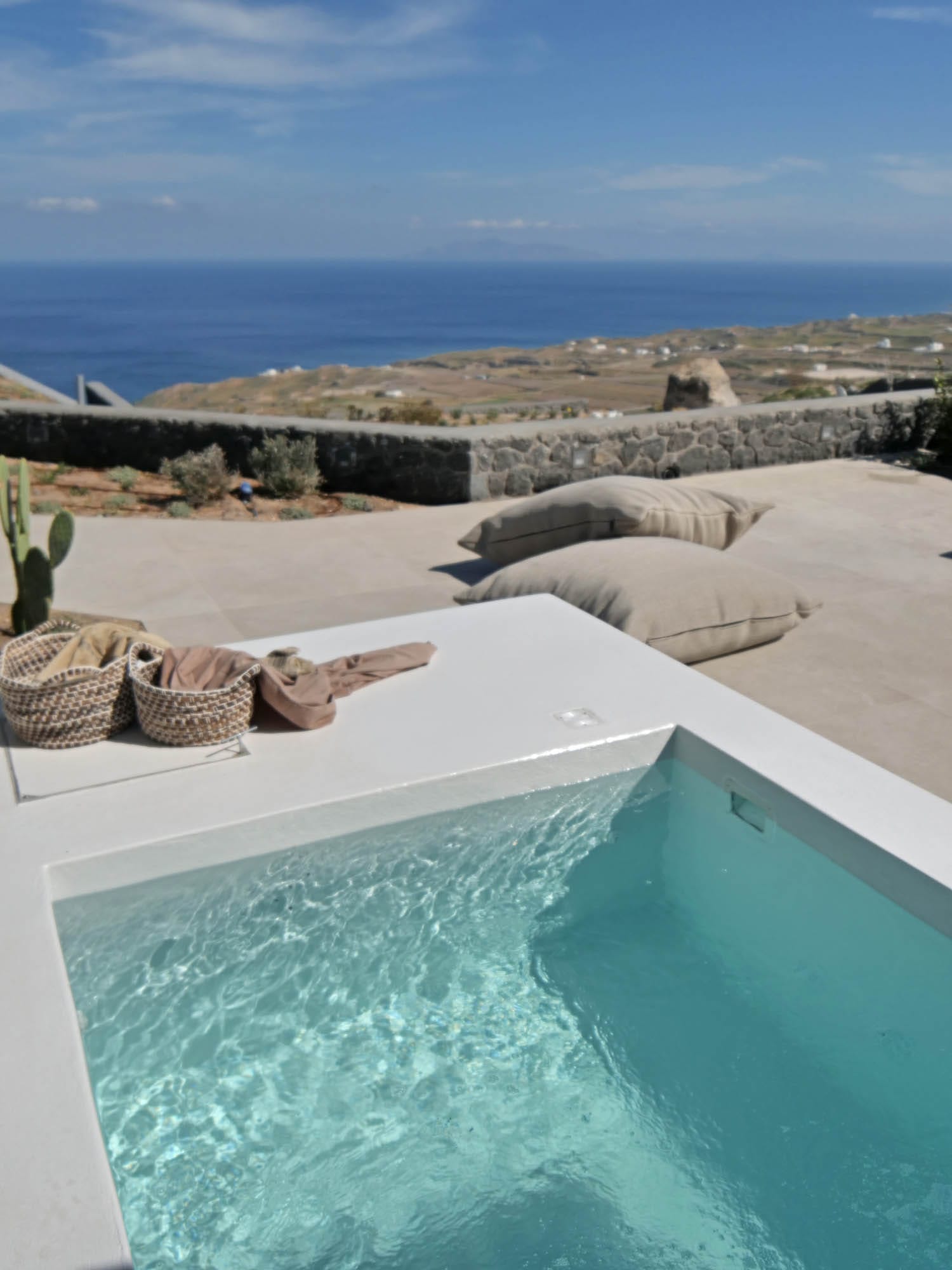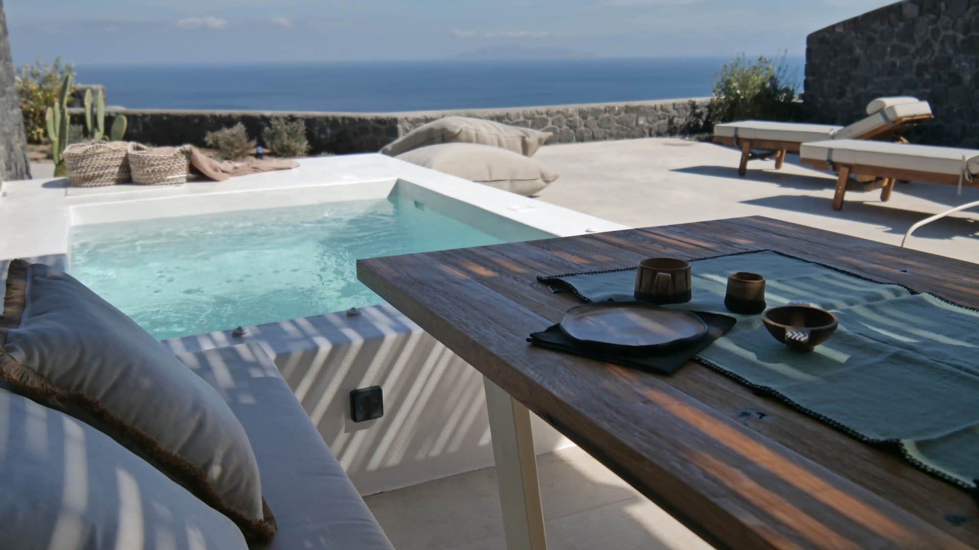 The spacious outdoor area is fitted with a built-in dining area and a heated Jacuzzi where you can enjoy your privacy and moments of pure romance in view of the indigo Aegean Sea.